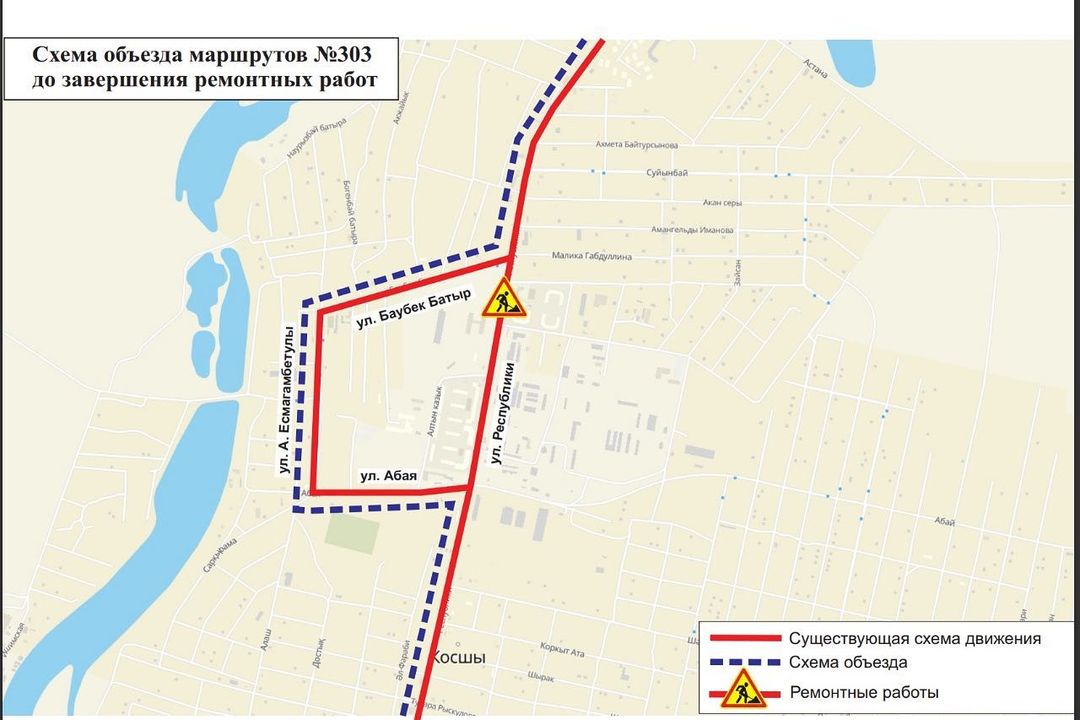 Жол жөндеу жұмыстары жүргізілуіне байланысты, № 303 бағдарды қозғалыс сызбасына уақытша өзгертулер енгізілді.