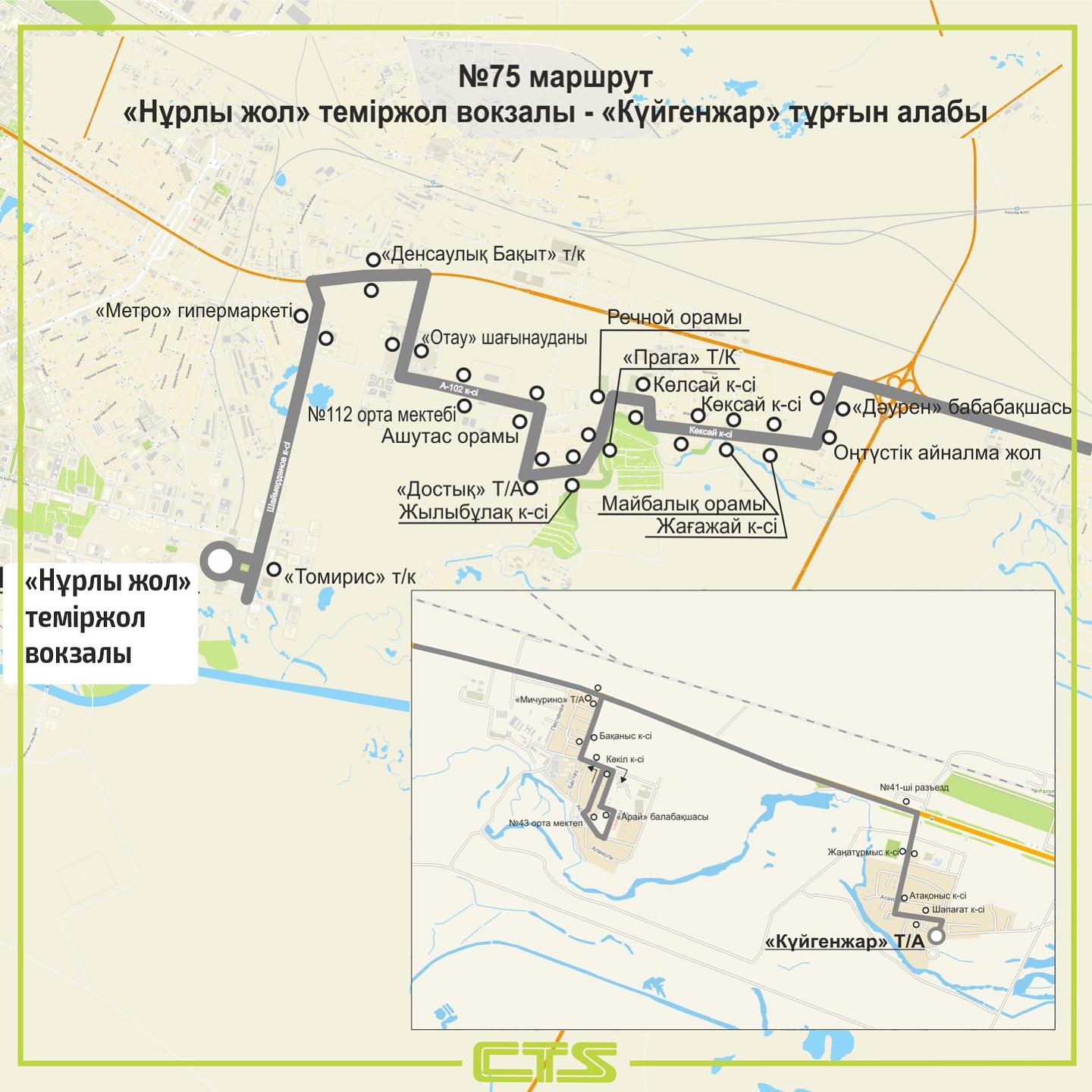 Ертең, 6 желтоқсаннан бастап, №75 бағдар «Нұрлы жол» теміржол вокзалы – Күйгенжар ТА аралығында жүре бастайды.