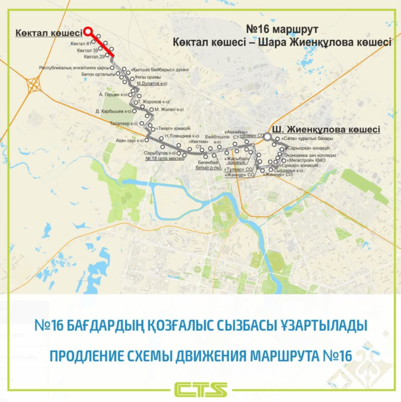 22 қарашадан бастап халықты көбірек қамту және Көктал көшесіндегі жаңа учаскеге қызмет көрсету мақсатында №16 бағыттың қозғалыс сызбасы ұзартылады.