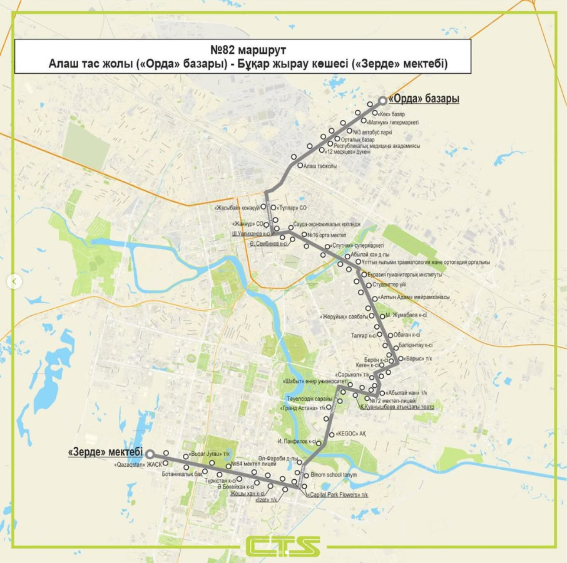 22 қарашадан №82 бағдар «Орда базары» – «Зерде мектебі» аралығында жүре бастайды.