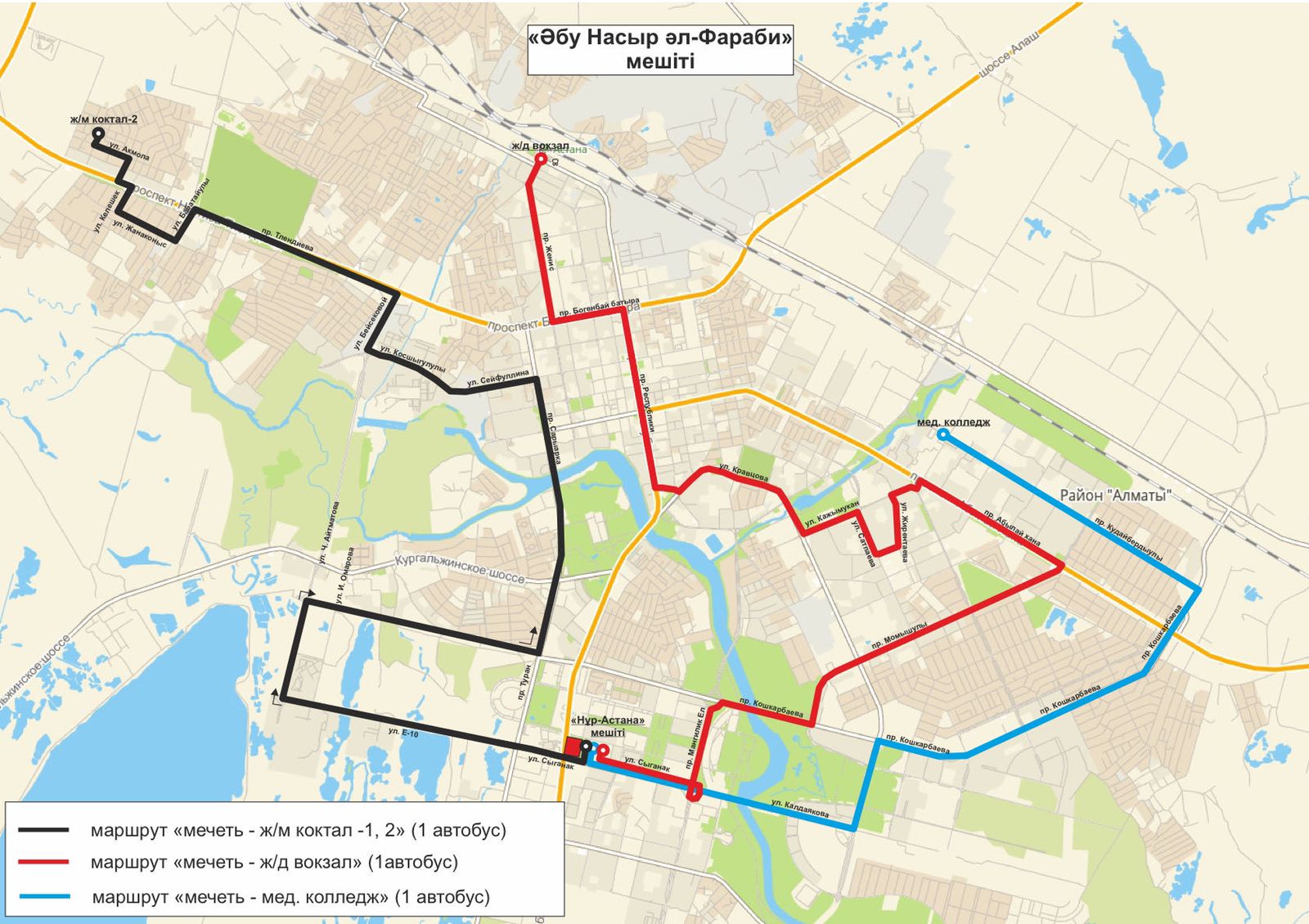 «Әбу Насыр әл-Фараби» мешітінен жүретін бағдарлардың бағыты: