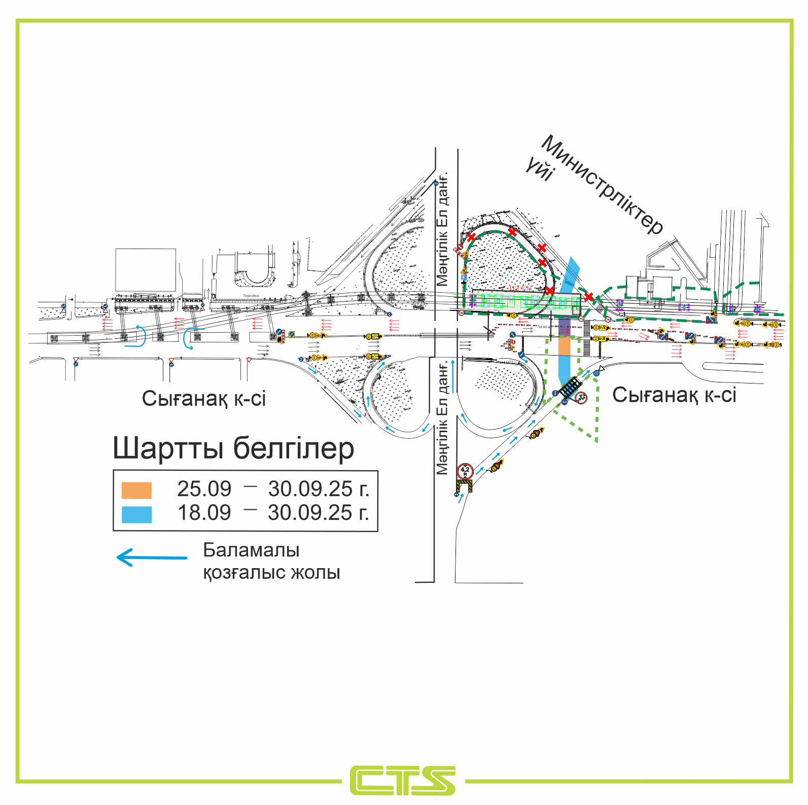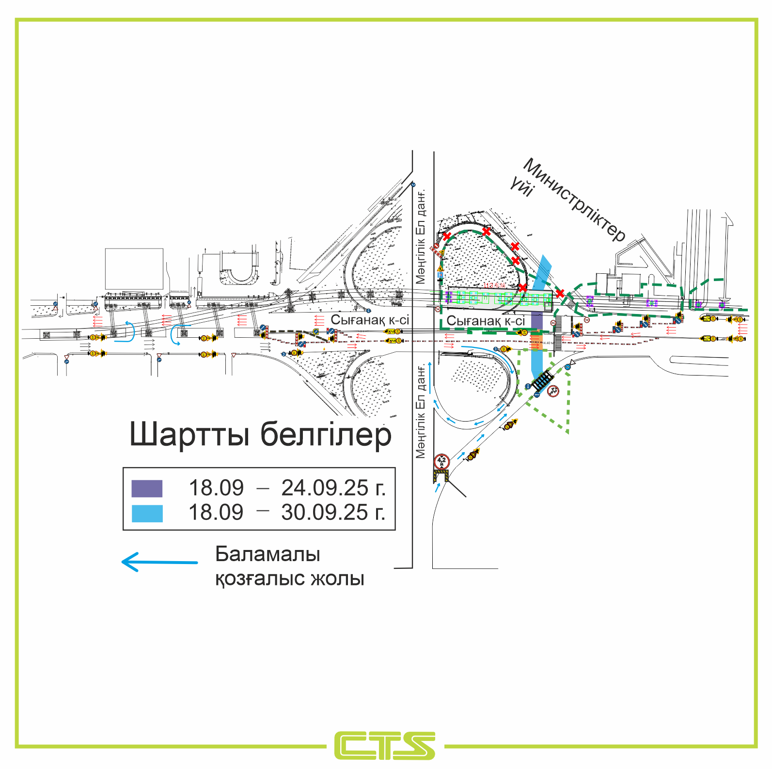 18 қыркүйек сағат 23:00-ден 30 қыркүйек аралығында LRT желісінде жүргізілетін жоспарлы жұмыстарға байланысты, Сығанақ көшесінің Мәңгілік ел даңғылымен қиылысында жол қозғалысына ішінара шектеу енгізіледі.