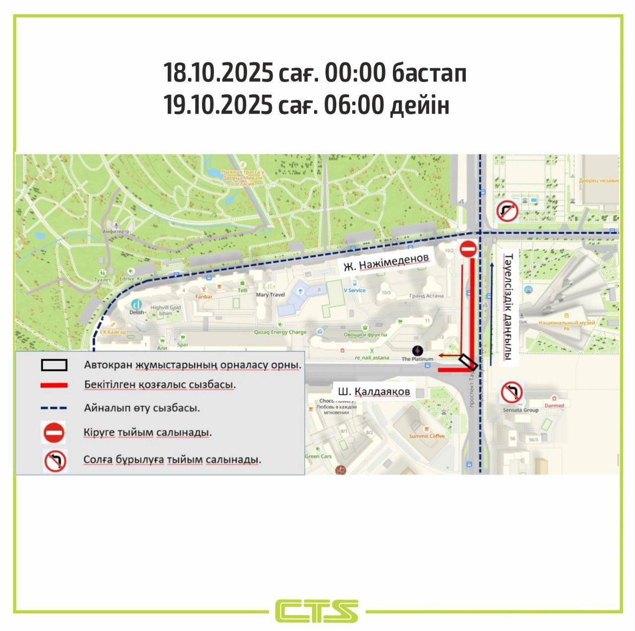18 қазан сағат 00:00-ден 19 қазан сағат 06.00-ге дейін мамандандырылған техниканы пайдалана отырып, көтеру-монтаждау жұмыстарын орындауға байланысты Ш. Қалдаяқов көшесі мен Тәуелсіздік даңғылы қиылыстарында автокөліктердің қозғалысы уақытша шектеледі.