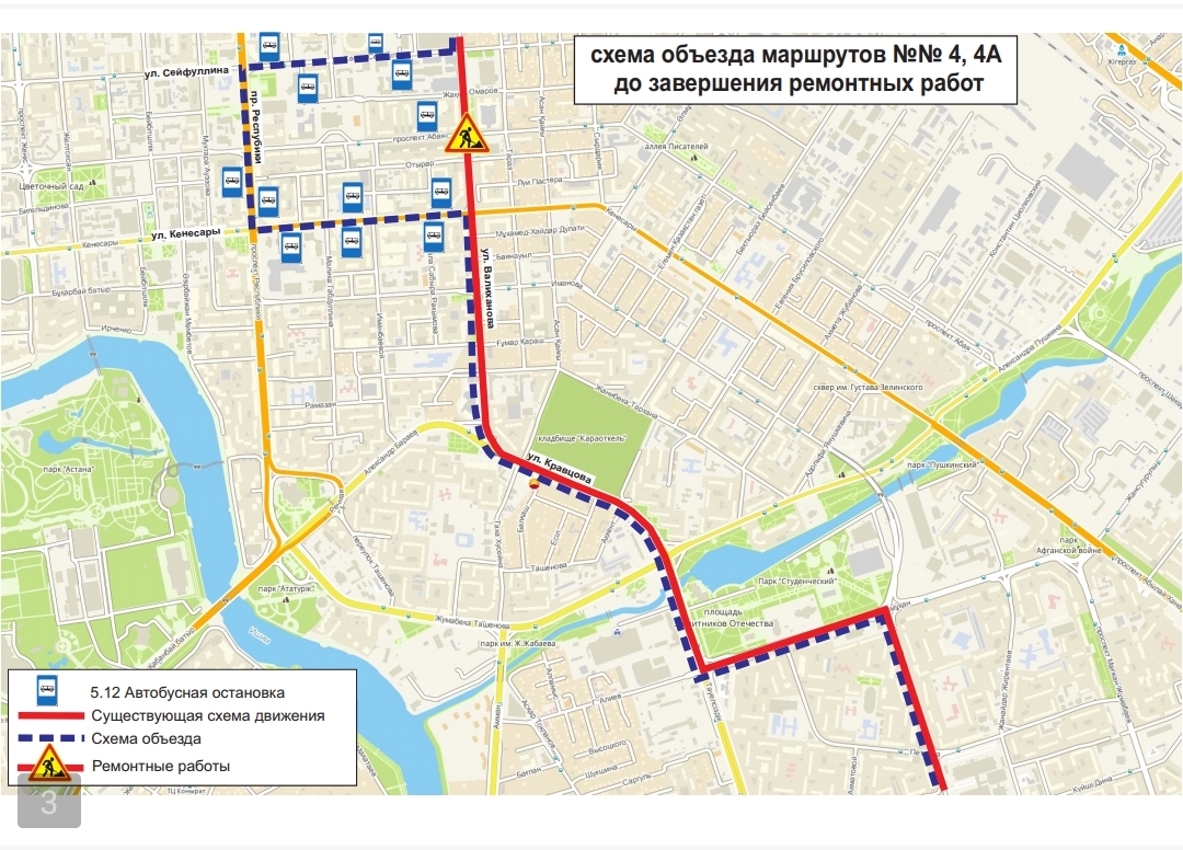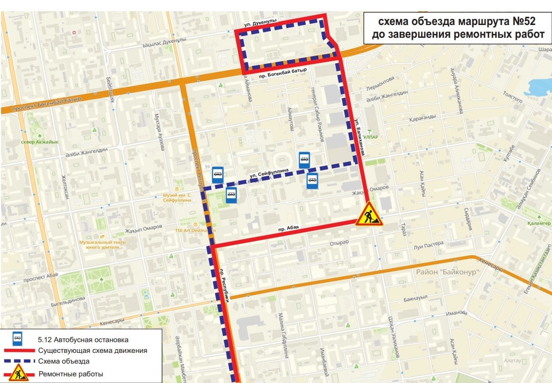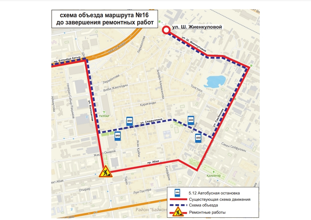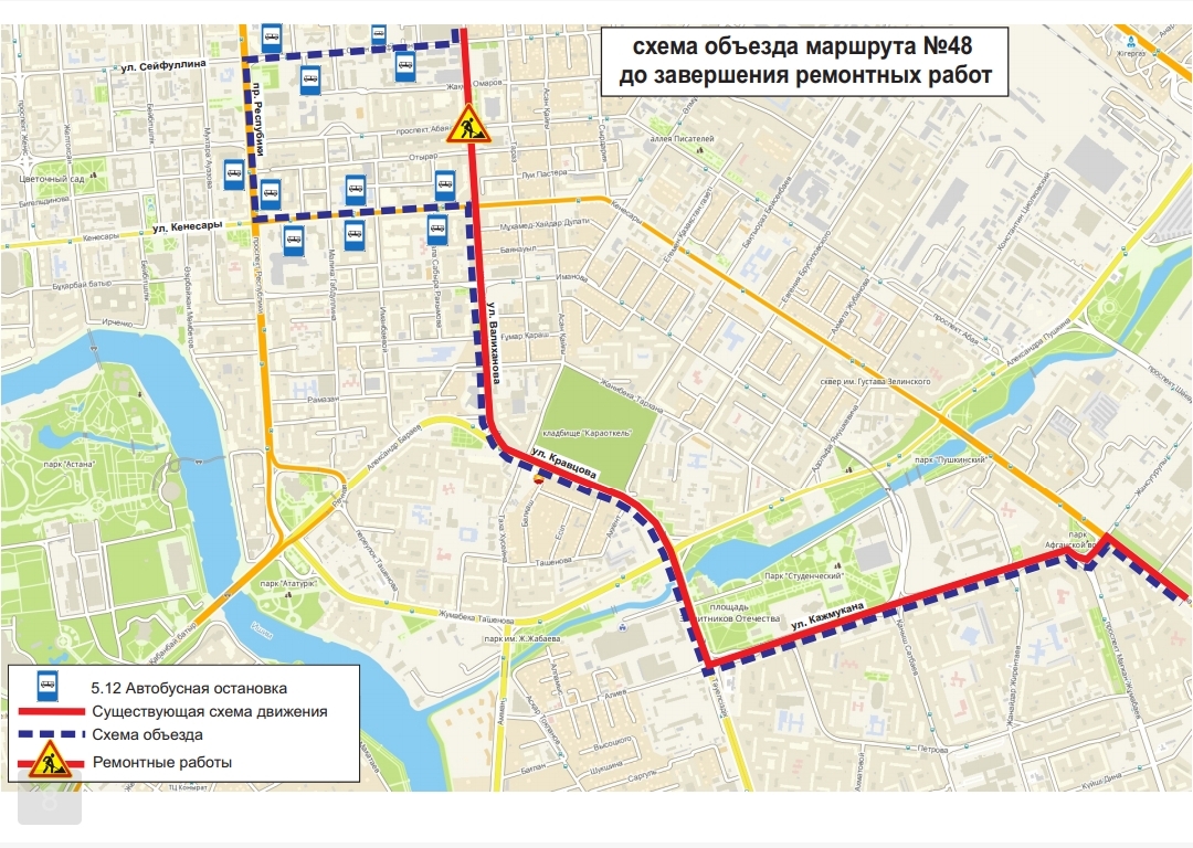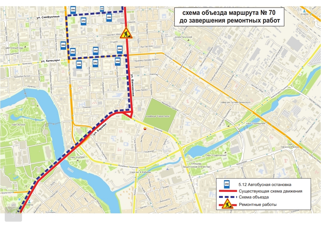 Жол жөндеу жұмыстары аяқталғанға дейін, №№1, 2, 4, 4А, 13, 16, 19, 24, 24Н, 33, 48, 52, 70, 71 бағдарларының қозғалыс сызбасы уақытша өзгерді