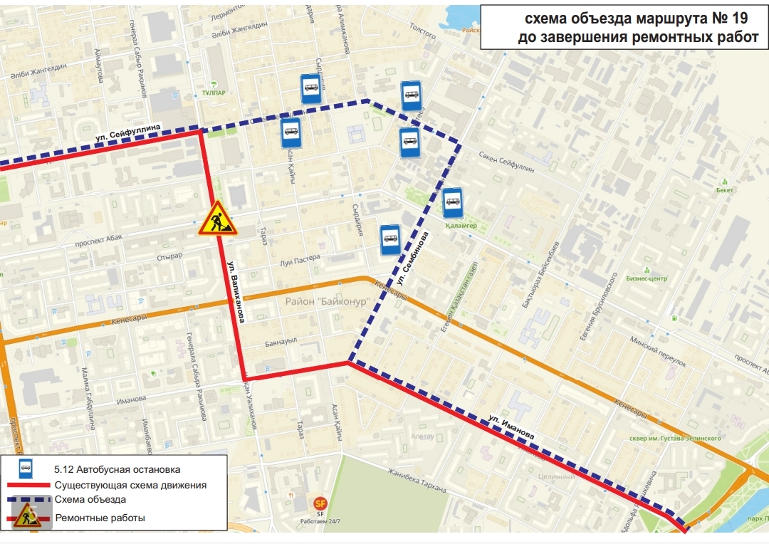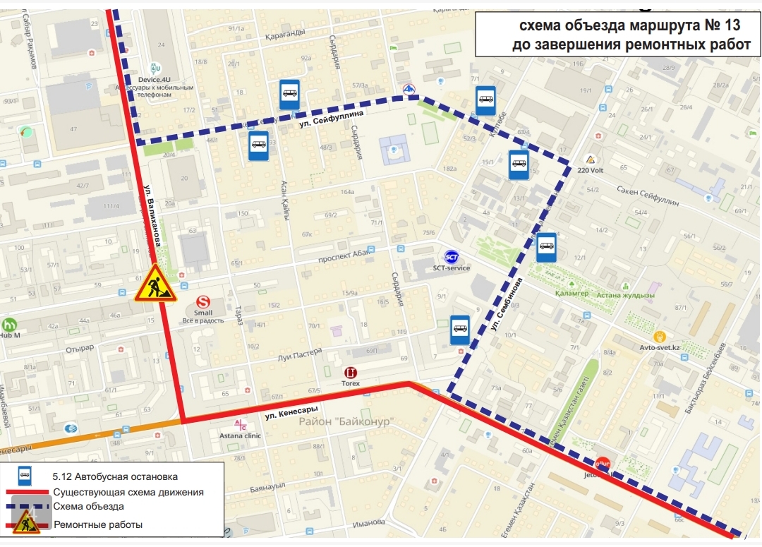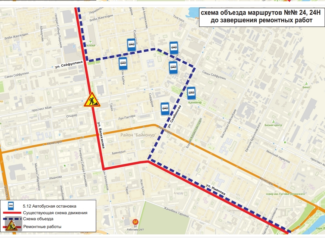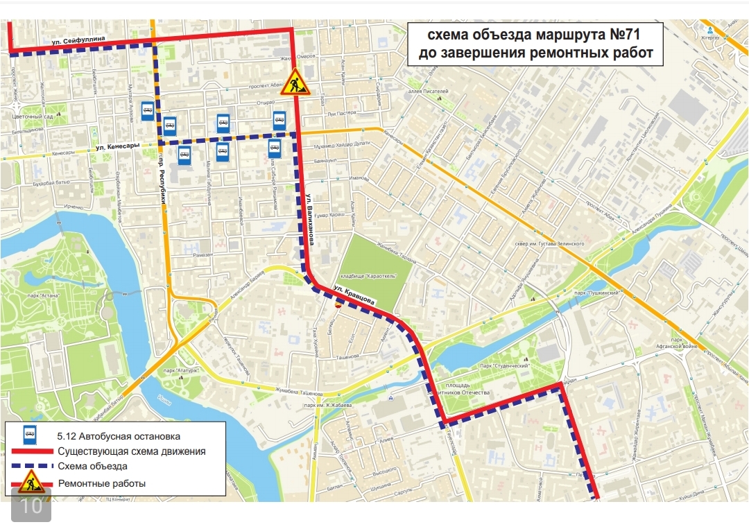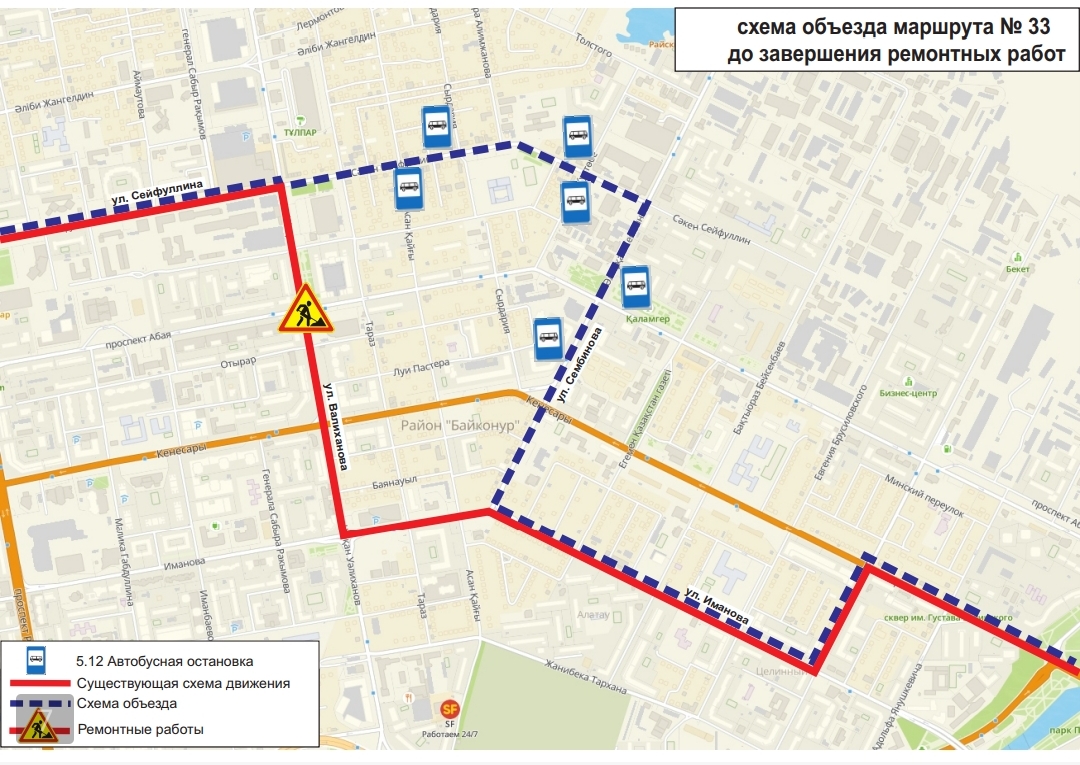 Жол жөндеу жұмыстары аяқталғанға дейін, №№1, 2, 4, 4А, 13, 16, 19, 24, 24Н, 33, 48, 52, 70, 71 бағдарларының қозғалыс сызбасы уақытша өзгерді