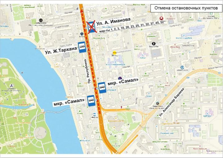 Аталған аялдамада №№ 1, 2, 3, 10, 20, 23, 25, 31, 32, 37, 45, 52 бағдарлары уақытша жолаушыларды отырғызып, түсірмейді.