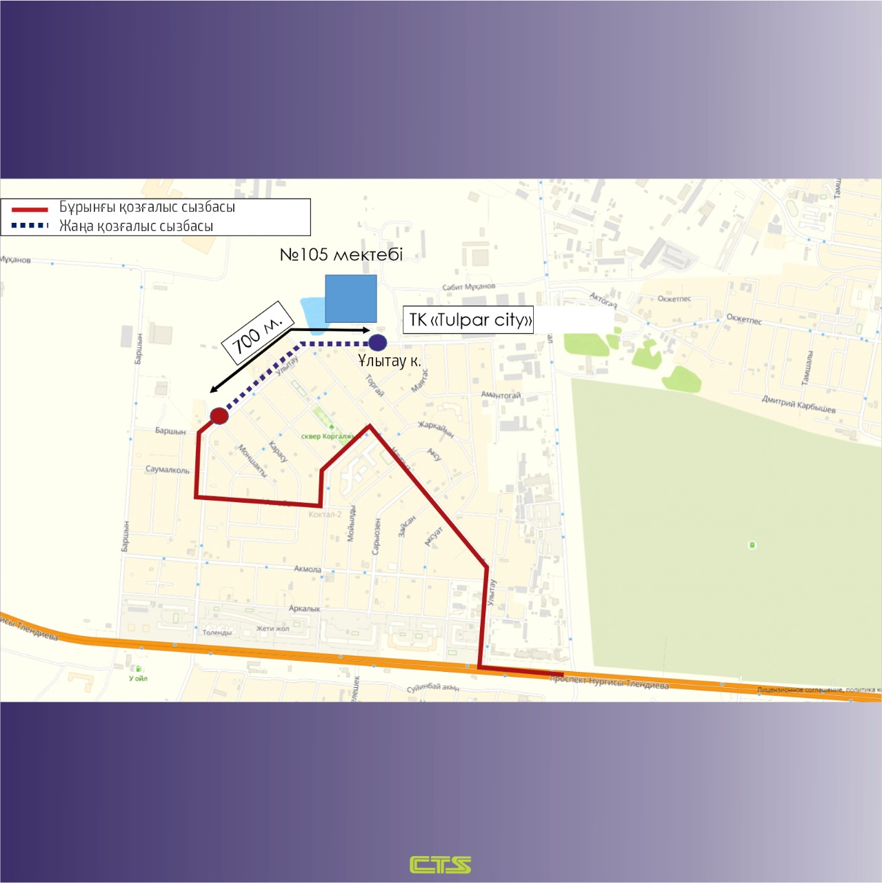 В целях улучшения обслуживания общественным транспортом, с 14 сентября, с субботы, схемы движения маршрутов №№ 4, 49 продлеваются прямо по ул. Улытау до ЖК «Tulpar City» и средней школы № 105. Данный участок обслуживался одним, № 71 маршрутом. Стоит отметить, что до этого данная остановка обслуживалась только одним маршрутом № 71.